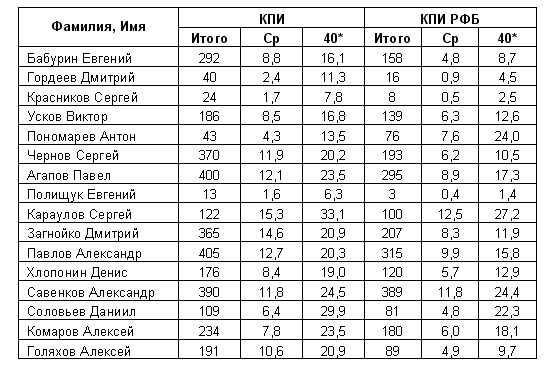Олег (МО) - да все верно - т.к. игроки разное время проводят на площадке, то я вывел статистику каждого игрока на 40 минут (стандартное время матча). По этому показателю более наглядно можно оценивать их КПИ.