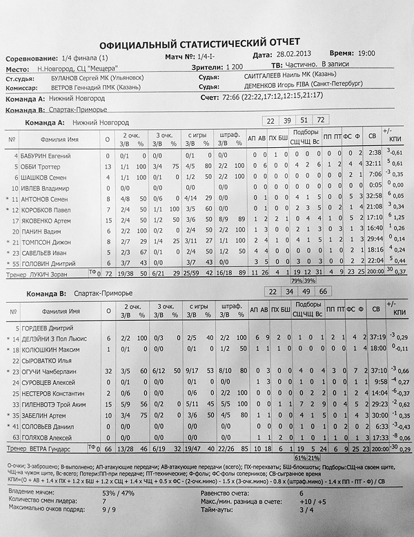 К сожалению, приморские болельщики, оставшиеся в поздний час у своих мониторов, дождались начало видеотрансляции из Нижнего Новгорода лишь к окончанию первой половины. К этому времени хозяева из роли догоняющих переквалифицировались в лидеров, хотя на протяжении всей первой четверти впереди был «Спартак-Приморье». Только в конце стартовой десятиминутки хозяева счет сравняли, - 22:22, а после второго периода вели с разницей в 5 очков, 39:34. БОльшую часть очков в первой половине спартаковцам принес Чемберлен Огучи, набравший за 17 минут игрового времени 22 очка.
