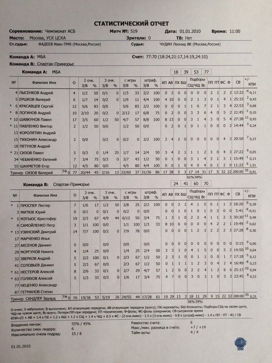 «Спартак-Приморье»: Мэтьюс – 19 очков (4 подбора, 1 передача, 1 перехват), Узинский – 14 (3 подбора), Нестеров – 8 (4 подбора, 1 передача), Проспер – 7 (5 подборов, 2 перехвата, 1 блокшот), Зверков – 5 (1 подбор, 2 передачи, 1 перехват), Соловьев – 5 (3 подбора, 1 перехват, 1 блокшот), Голяхов – 5 (3 подбора, 4 передачи), Моргунов – 4 (5 подборов, 3 передачи, 1 перехват), Самойленко – 3 (8 передач, 6 перехватов), Митюк (1 подбор, 1 перехват), Аксенов.